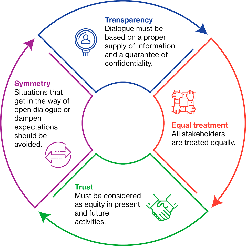 Successful relations with our stakeholders are sustained by a series of principles and synergies between them; this means that we generate value for everyone, magnifying the positive impacts of the company’s activities, securing a financial return and contributing to socioeconomic development. These principles are the following: