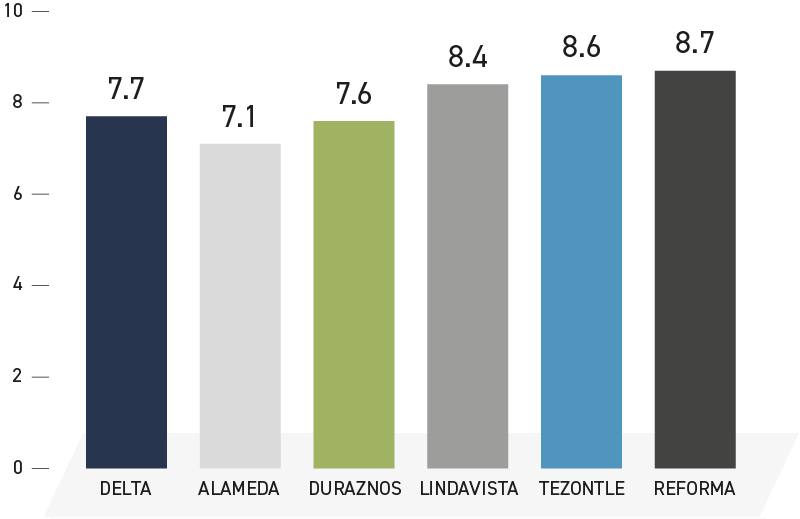 Se realizó una encuesta de satisfacción en cinco de nuestros centros comerciales: Parque Delta, Parque Alameda, Parque Lindavista, Parque Tezontle y Reforma 222. Generamos un formato de encuesta de satisfacción de clientes (locatarios) con relación al servicio brindado por la administración, lo cual nos permitió medir índices de satisfacción y establecer un programa de mejora continua.