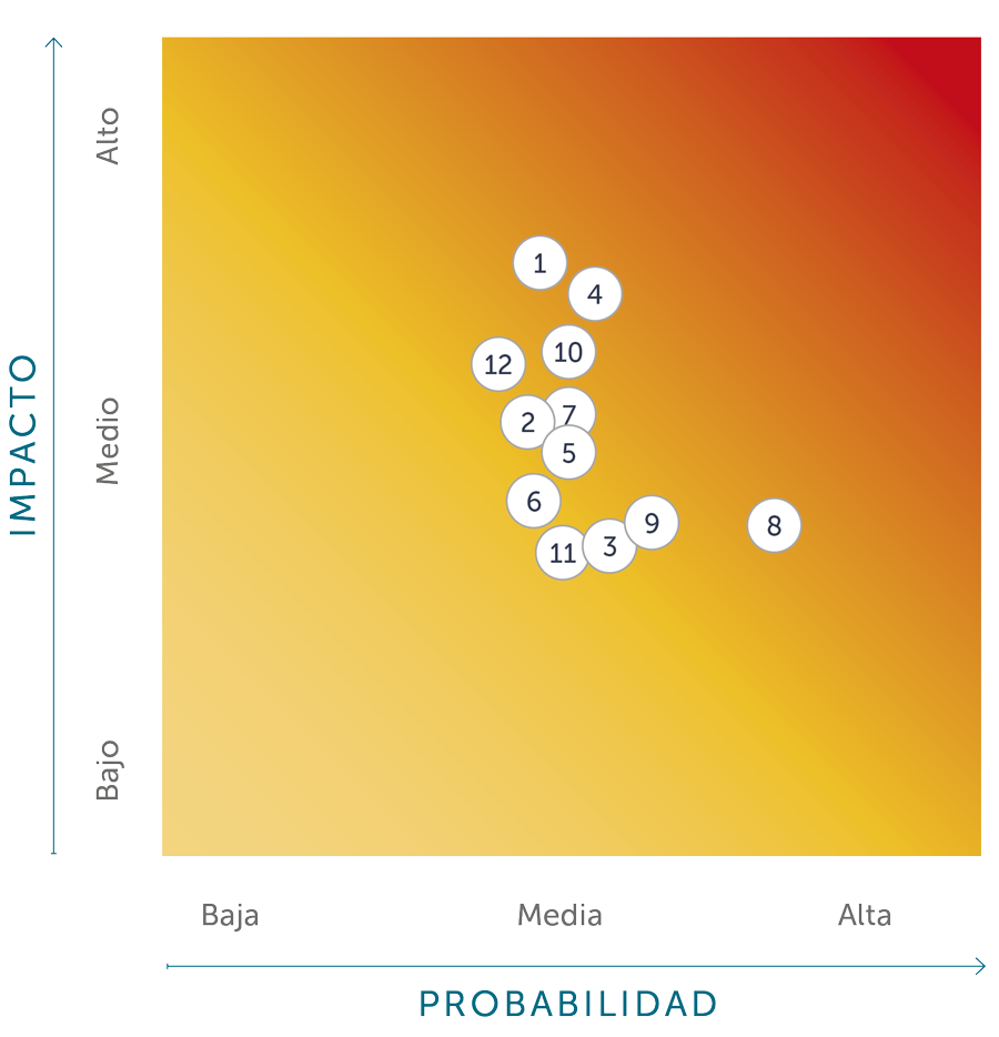 El análisis de riesgos relacionados con derechos humanos se realizó paralelamente al análisis de materialidad 2023. Con base en la identificación y evaluación de riesgos se realizó un cruce entre los temas potencialmente materiales y los temas de derechos humanos encontrados durante el diagnóstico. Lo anterior permite obtener una valoración de severidad en términos de derechos humanos que puede analizarse en una matriz de riesgos o mapa de calor.