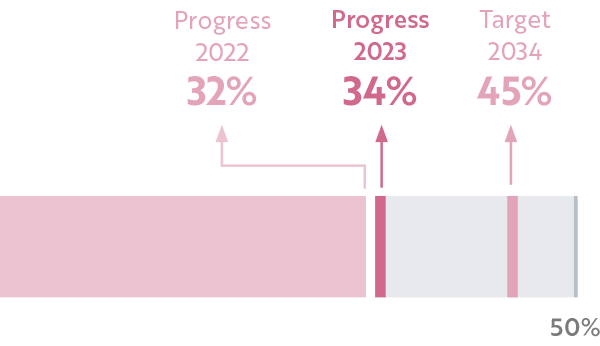 We know that the road to gender equality is challenging, but it is in our hands to make sure that it is not a long one. In 2023 we pledged, within our Sustainability-Linked Financing Framework, to increase the proportion of women in decision-making positions to at least 45% by 2034, considering management and leadership levels.