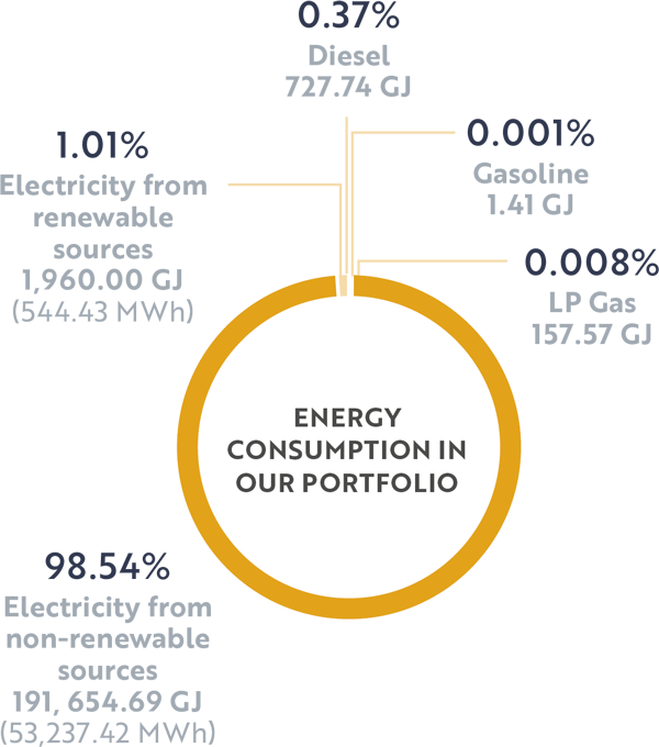 We work with an ESG data intelligence platform, which measures our energy consumption directly from receipts and calculates scope 1 and 2 GHG emissions in real time, increasing the transparency and confidence of our data. In 2023, the organization’s total energy consumption was 194,501.36 GJ and energy intensity was 0.13 GJ/m2.