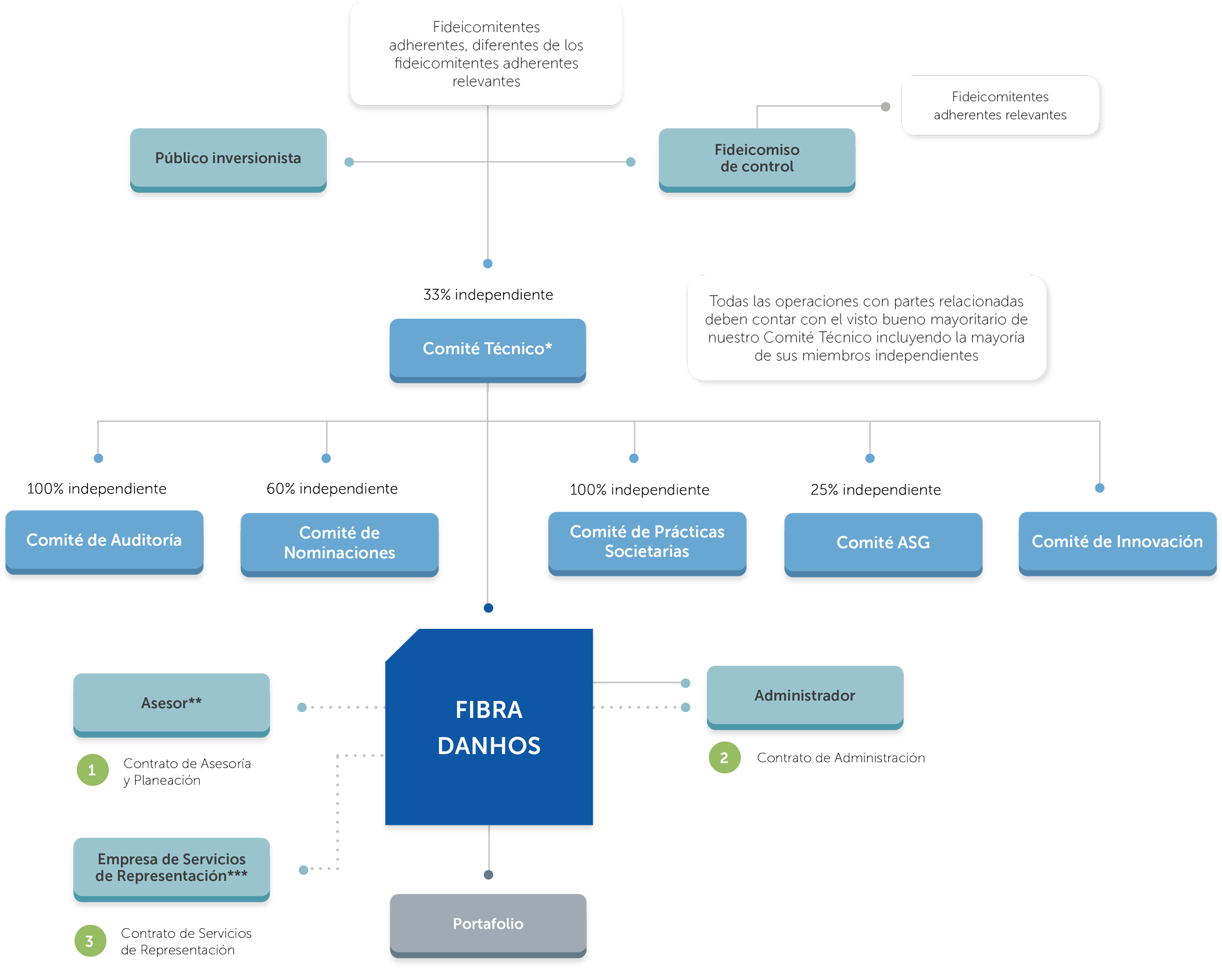 El máximo órgano de gobierno de Fibra Danhos es el Comité Técnico el cual, para apoyar el desempeño de sus funciones, cuenta con los siguientes comités: Auditoría, ASG, Innovación, Nominaciones y Prácticas Societarias, los cuales contribuyen a su gestión estratégica. Su entendimiento sustancial y amplio conocimiento de la industria permiten el crecimiento de nuestro grupo y la operación de nuestro portafolio, caracterizado por inmuebles icónicos y de calidad premier.