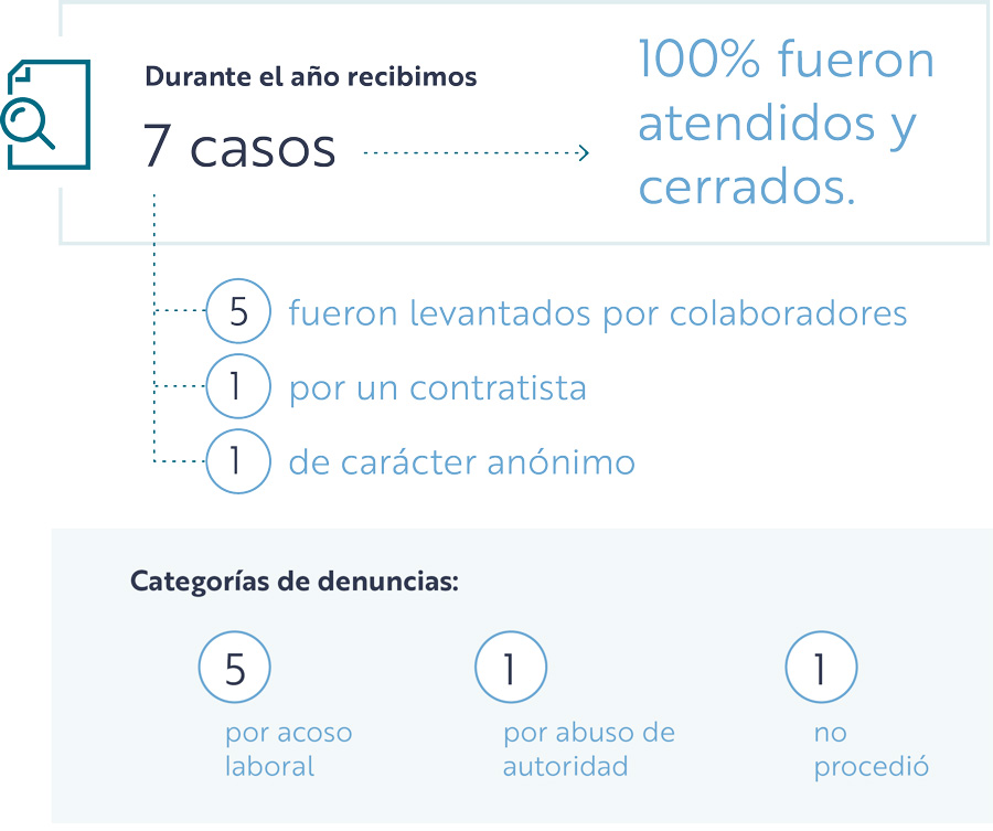 Velamos por el cumplimiento de nuestro Código de Ética y, con un enfoque preventivo, brindamos a nuestros colaboradores herramientas para reportar incumplimientos o consultar cualquier inquietud. Para ello contamos con una Línea Ética gestionada por un tercero, Global Ethics, una empresa de clase mundial dedicada a los sistemas éticos de denuncia, lo cual garantiza la imparcialidad en el tratamiento de las situaciones.