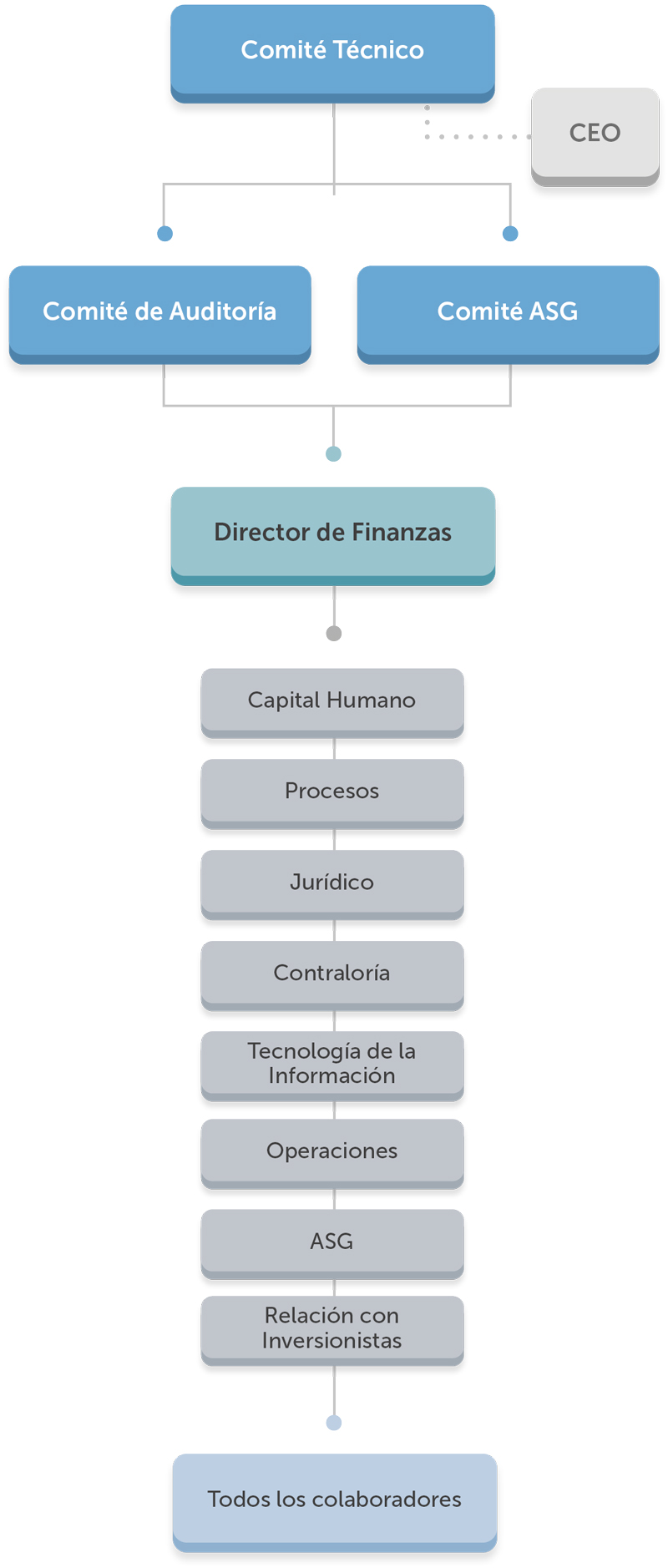 El Comité ASG es responsable de supervisar y monitorear la gestión de riesgos climáticos, sociales y de gobernanza, y de informarle al Comité Técnico sobre los mismos.