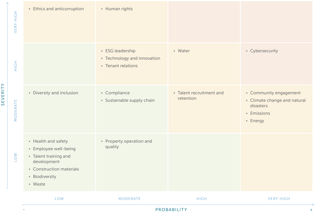 | Liderazgo ASG | La posibilidad de que el máximo órgano de gobierno de Fibra Danhos no opere con una filosofía de negocio responsable y con perspectiva de continuidad operativa de largo plazo al considerar criterios y riesgos ASG del negocio, y tomar decisiones sin conocer sus impactos, podría provocar la pérdida de oportunidades de inversión. | Las consecuencias pueden ser diversas y con distinta magnitud; sin embargo, los inversionistas son los principales interesados en contar con un enfoque de inversión sostenible y responsable. Por lo tanto, si no contamos con un enfoque sólido de sostenibilidad podríamos perder la confianza de los inversionistas, disminuyendo las oportunidades de inversión. |