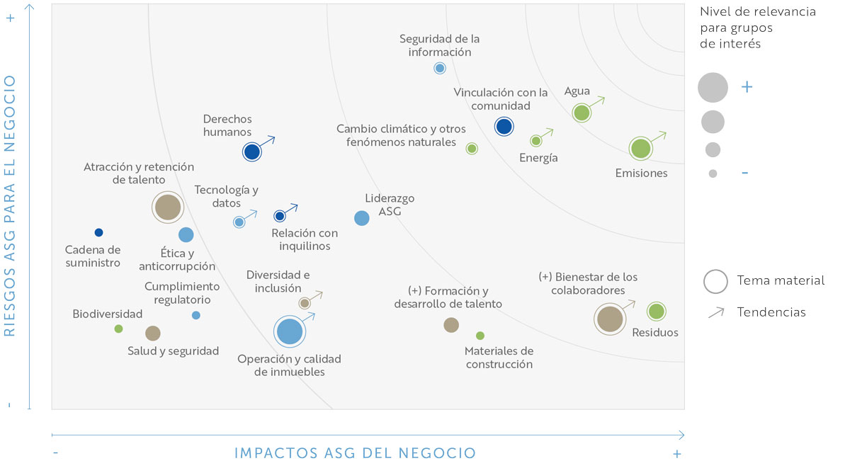 | Cambio climático y otros fenómenos | Efectos sobre la integridad física y mental de los colaboradores, visitantes e inquilinos al operar inmuebles en zonas de alto riesgo sísmico y diferentes fenómenos atmosféricos. | Visitantes Comunidad Inquilinos Inversionistas Colaboradores Proveedores |